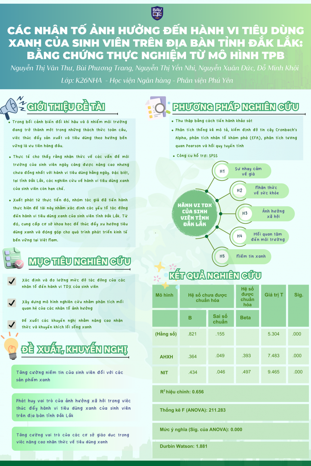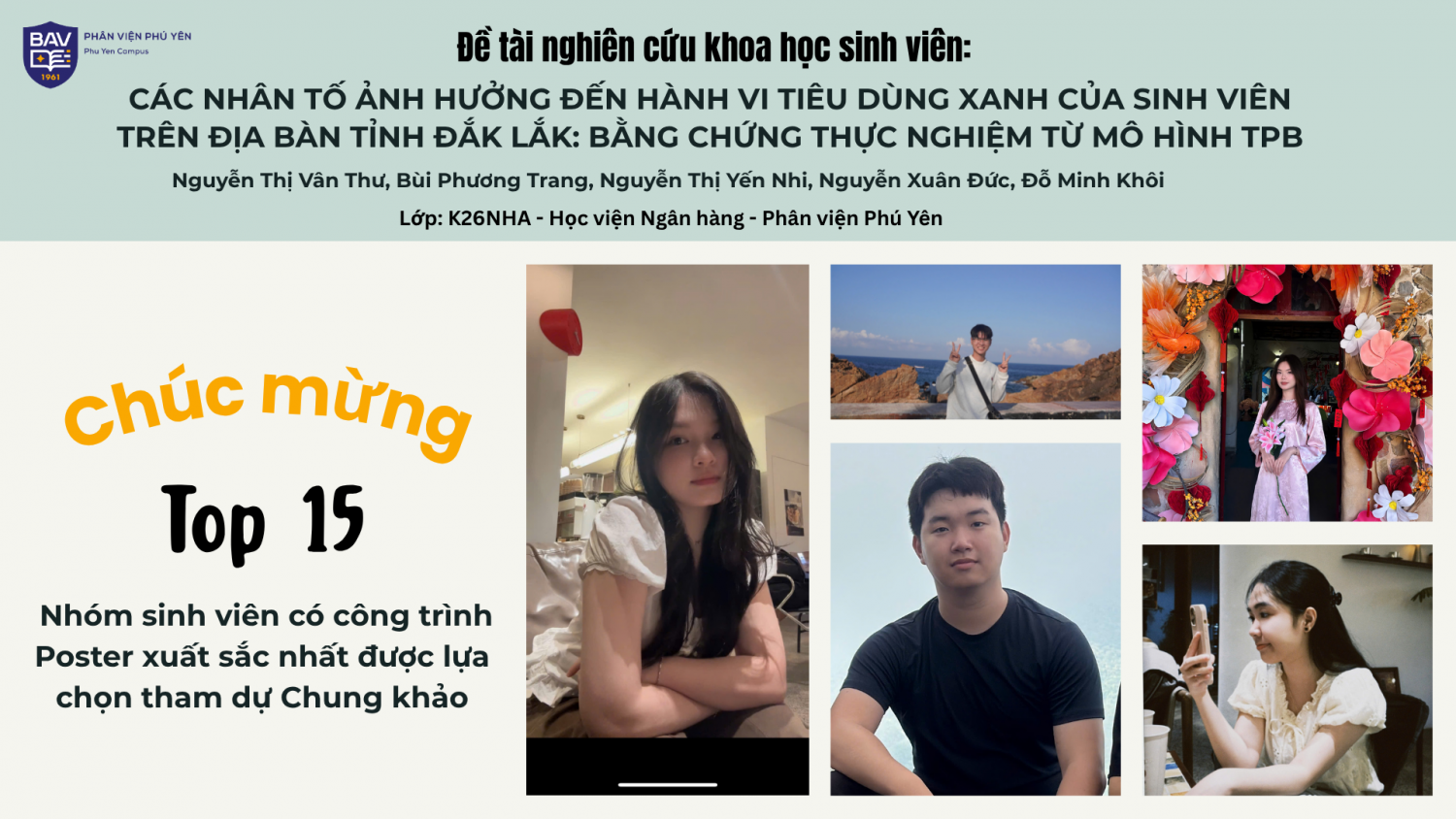 🎓 Nhóm sinh viên gồm: Nguyễn Thị Vân Thư, Bùi Phương Trang, Nguyễn Thị Yến Nhi, Nguyễn Xuân Đức, Đỗ Minh Khôi (Lớp: K26NHA) đã xuất sắc ghi dấu ấn với Poster của đề tài: “𝐂𝐚́𝐜 𝐧𝐡𝐚̂𝐧 𝐭𝐨̂́ 𝐚̉𝐧𝐡 𝐡𝐮̛𝐨̛̉𝐧𝐠 đ𝐞̂́𝐧 𝐡𝐚̀𝐧𝐡 𝐯𝐢 𝐭𝐢𝐞̂𝐮 𝐝𝐮̀𝐧𝐠 𝐱𝐚𝐧𝐡 𝐜𝐮̉𝐚 𝐬𝐢𝐧𝐡 𝐯𝐢𝐞̂𝐧 𝐭𝐫𝐞̂𝐧 đ𝐢̣𝐚 𝐛𝐚̀𝐧 𝐭𝐢̉𝐧𝐡 Đ𝐚̆́𝐤 𝐋𝐚̆́𝐤: 𝐁𝐚̆̀𝐧𝐠 𝐜𝐡𝐮̛́𝐧𝐠 𝐭𝐡𝐮̛̣𝐜 𝐧𝐠𝐡𝐢𝐞̣̂𝐦 𝐭𝐮̛̀ 𝐦𝐨̂ 𝐡𝐢̀𝐧𝐡 𝐓𝐏𝐁” – một hướng nghiên cứu mang tính thời sự, góp phần thúc đẩy nhận thức và hành vi tiêu dùng bền vững trong cộng đồng sinh viên.