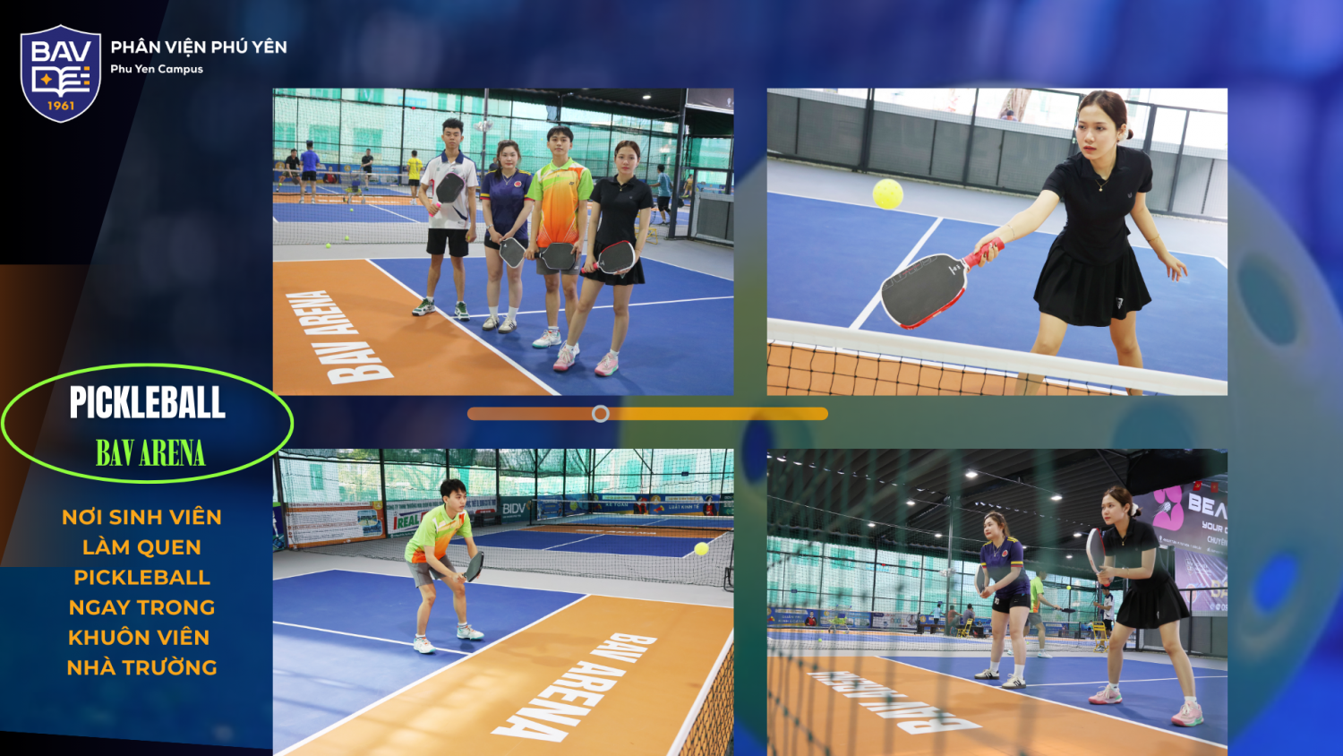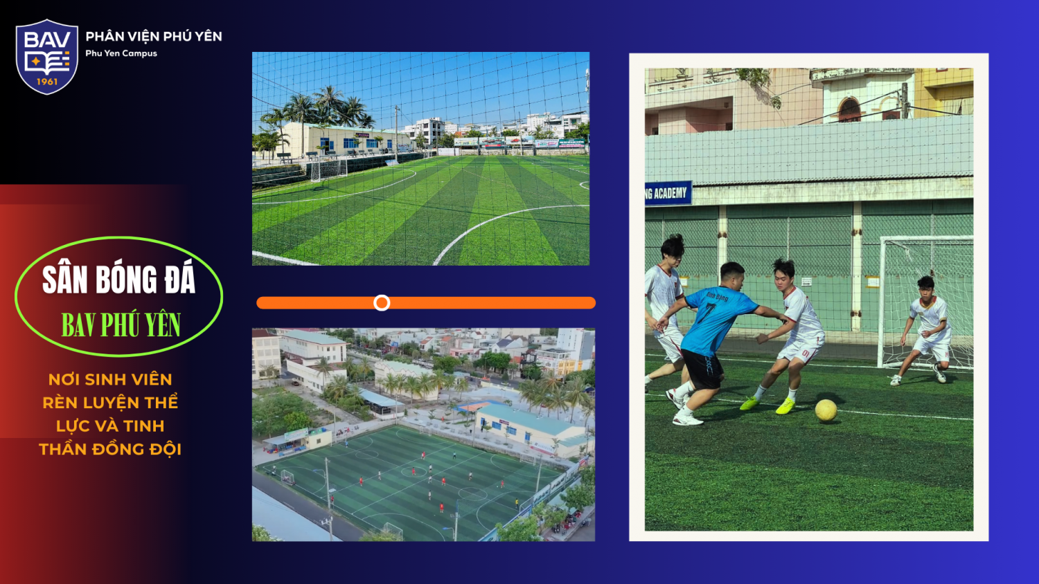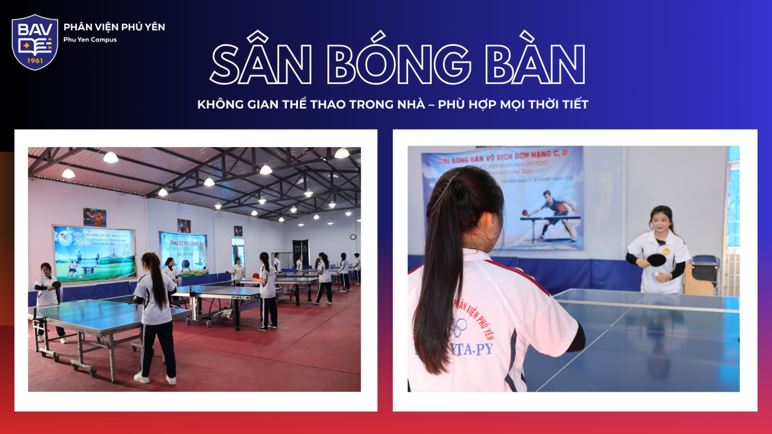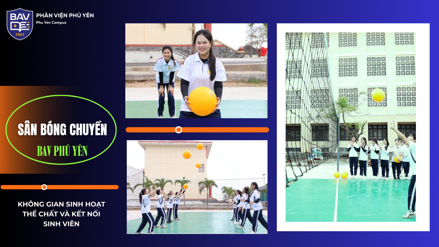 Tại BAV Phú Yên, đời sống đại học của sinh viên không chỉ gói gọn trong những giờ học trên giảng đường. Song hành với hoạt động học tập, nhà trường luôn chú trọng xây dựng môi trường rèn luyện thể chất, thư giãn tinh thần và kết nối cộng đồng sinh viên thông qua hệ thống khu thể thao ngay trong khuôn viên trường.