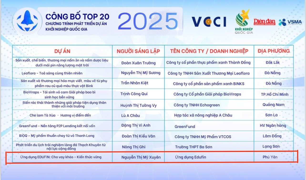 Học viện Ngân hàng – Phân viện Phú Yên vui mừng và tự hào thông báo: dự án “Ứng dụng EDUFIN: Cho vay khéo – Kiến thức vững” của nhóm sinh viên Nguyễn Thị Mỹ Xuyên (lớp 25NHA) và Nguyễn Đình Đức (lớp 25NHB) đã chính thức lọt Top 20 Chương trình Phát triển Dự án Khởi nghiệp Quốc gia năm 2025.