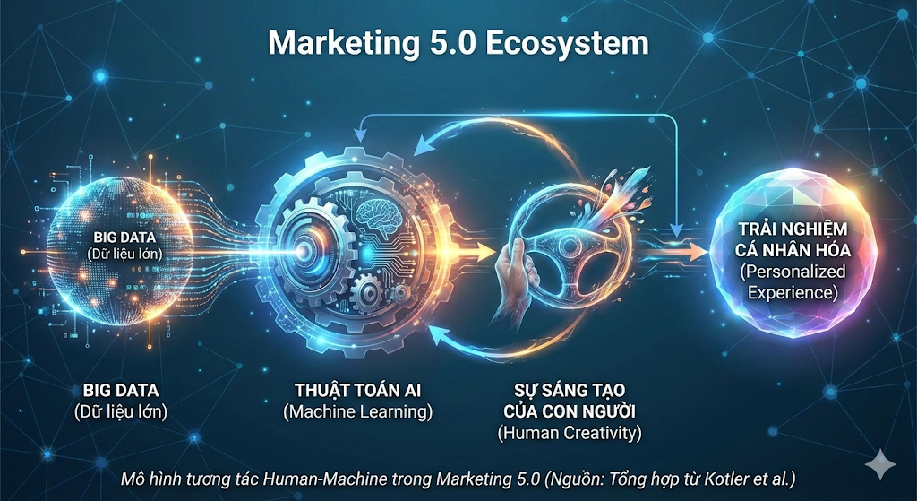 Kỷ nguyên số 2025 đánh dấu bước ngoặt căn bản trong tư duy quản trị tiếp thị. Theo lý thuyết của Philip Kotler trong Marketing 5.0, thị trường đang chứng kiến sự hội tụ giữa "công nghệ bắt chước con người" (AI, NLP) và hành vi tiêu dùng số. Tiếp thị không còn giới hạn ở việc quảng bá sản phẩm (Product-centric) mà đã chuyển sang kiến tạo trải nghiệm khách hàng dựa trên dữ liệu (Data-driven Customer Experience).