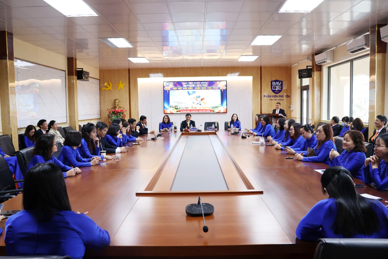 Sáng ngày 25/02/2025, tại Phòng Hội nghị Học viện Ngân hàng – Phân viện Phú Yên, tập thể cán bộ, giảng viên Phân viện đã trang trọng tổ chức chương trình Gặp mặt đầu năm – Xuân Bính Ngọ 2026. Đây không chỉ là dịp gửi trao những lời chúc tốt đẹp đầu xuân, mà còn là thời điểm để toàn thể đơn vị cùng xác lập tinh thần hành động và quyết tâm thực hiện thắng lợi nhiệm vụ năm mới.