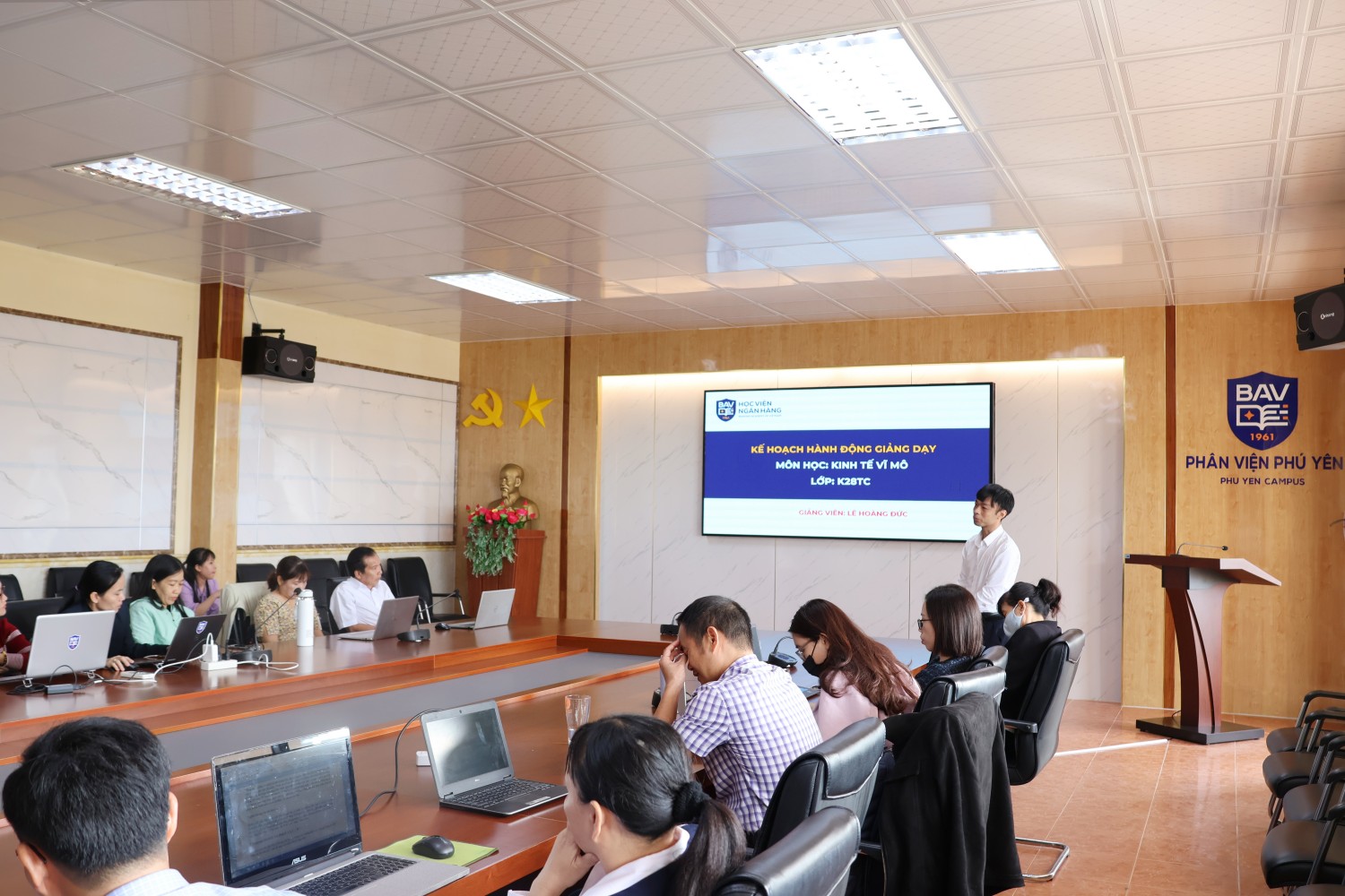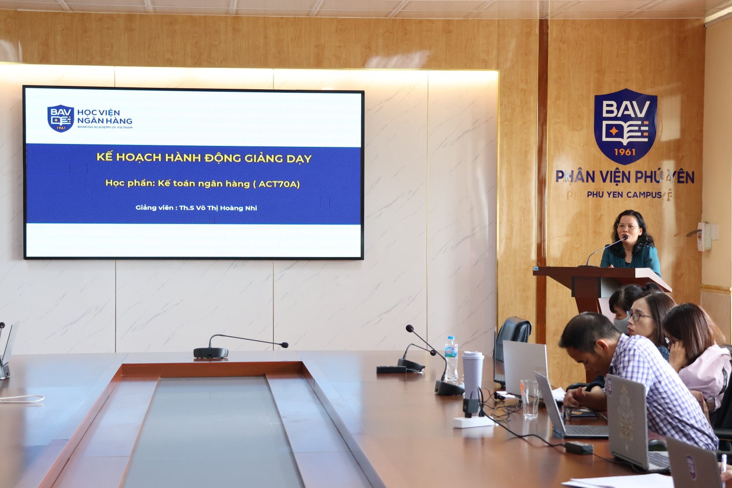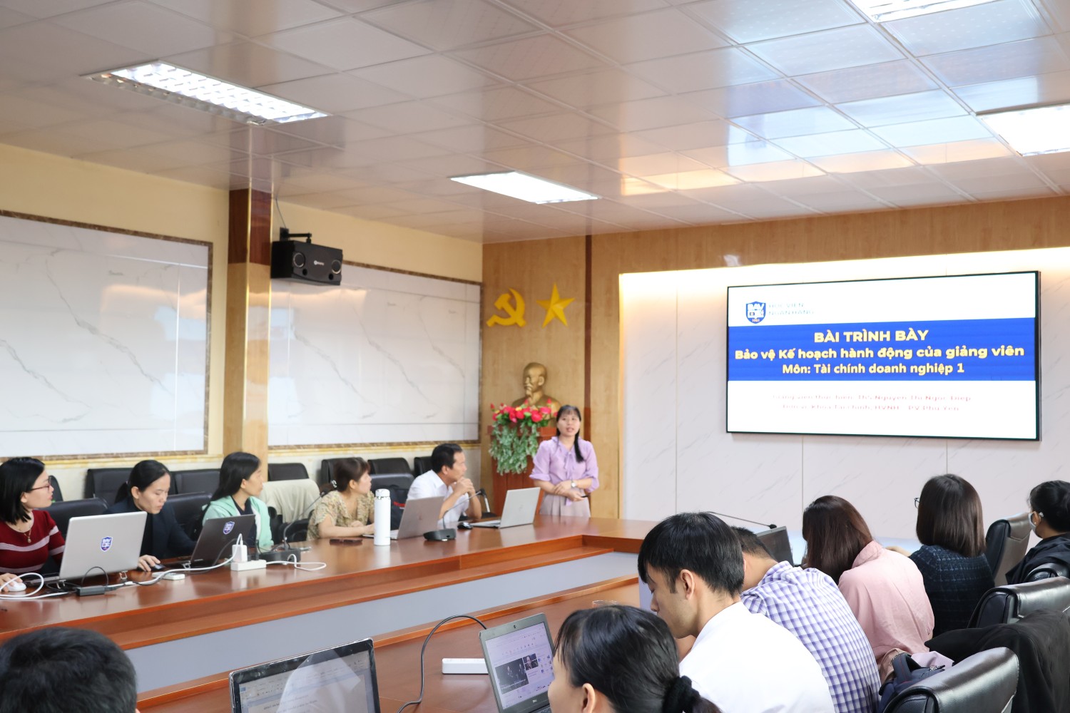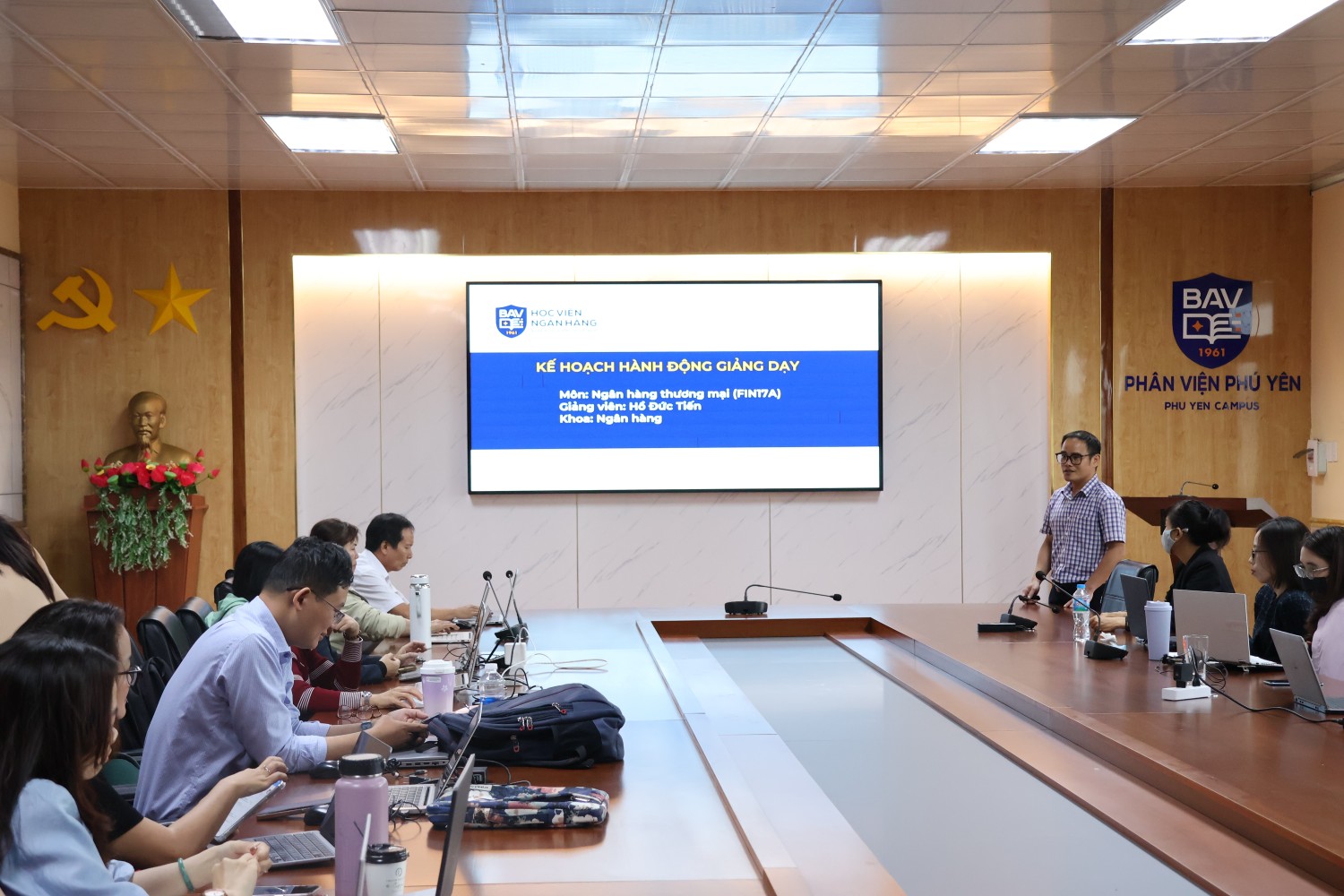 Sáng ngày 12/03/2026, Học viện Ngân hàng – Phân viện Phú Yên đã tổ chức buổi bảo vệ “Kế hoạch hành động của giảng viên” học kỳ II, năm học 2025–2026. Đây là hoạt động chuyên môn quan trọng, tạo điều kiện để đội ngũ giảng viên cùng nhìn nhận, điều chỉnh và hoàn thiện kế hoạch giảng dạy; qua đó không ngừng đổi mới phương pháp, nâng cao chất lượng đào tạo và tối ưu hóa hiệu quả học tập cho sinh viên.